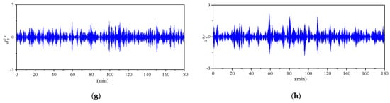 Wavelet packet coefficients in different frequency bands. (a) Frequency band 1 (0 to 0.0625 Hz), (b) frequency band 2 (0.0625 to 0.125 Hz), (c) frequency band 3 (0.125 to 0.1875 Hz), (d) frequency band 4 (0.1875 to 0.25 Hz), (e) frequency band 5 (0.25 to 0.3125 Hz), (f) frequency band 6 (0.3125 to 0.375 Hz), (g) frequency band 7 (0.375 to 0.4375 Hz), (h) frequency band 8 (0.4375 to 0.5 Hz).