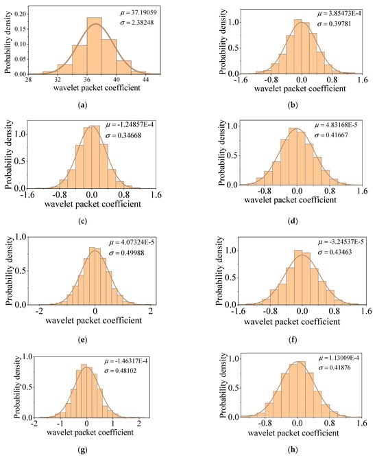 The probability of the wavelet packet coefficients for the convective heat resistance samples shown in Figure 7 is statistically analyzed by the proposed method. Figure 11 shows the probability density function of the wavelet packet coefficients in different frequency bands. From the results, it can be found that the wavelet packet coefficients in the experiment in this paper basically obey the normal distribution.