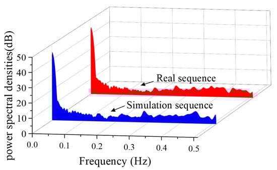 Figure 12 shows a comparison of the power density spectrum between the simulated sequence and the sample sequence of convective heat resistance. Power spectral density is a random process analysis method that reflects the distribution characteristics of signal power at different frequencies []. The similarity between different power spectral densities can be used to analyze the difference in random characteristics between different random processes. According to the Pearson correlation coefficient calculation method [], the similarity of the power spectral density between the simulated sequence and the sample sequence is 98.53%. Since the similarity is close to 1, the random characteristics between the simulated sequence and the sample sequence are basically the same. This indicates that the proposed method accurately simulates the random characteristics of convective heat resistance in natural air-cooling environments.