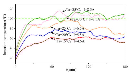 To verify the above thermal safety assessment results, the converter in the experiment platform is operated under the current and ambient temperatures shown in Table 3 and the natural air-cooled environment shown in Figure 4. The junction temperature variation in device Q1 in the experiment is shown in Figure 15. It can be seen that the junction temperature exceeds Tjmax in groups #1 and #2. The junction temperature in group #3 is less than Tjmax, but its maximum value is close to Tjmax. In groups #4 and #5, the junction temperature is much smaller than Tjmax. These experimental phenomena are consistent with the results of the thermal safety assessment. This indicates that, based on the wavelet packet transform and Monte Carlo methods, the proposed method effectively simulates the influence of random airflow on the device junction temperature of converters under the natural air-cooled environments. The thermal safety of other devices in the converter can also be evaluated by the proposed method, but this is not explored here.