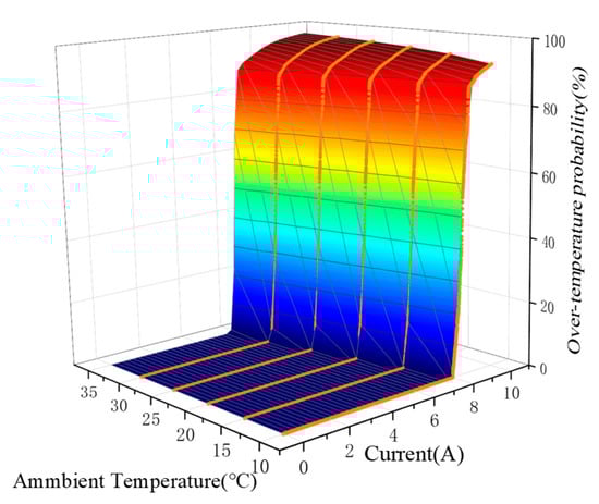The over-temperature probability of the device Q1 under different converter currents and ambient temperatures is obtained with the simulated junction temperatures. By using fifth-order polynomial fitting, the Pearl function for calculating the probability of over-temperature can be established. The fitting coefficients are listed in Table 2 and Figure 14, showing the over-temperature probability surface calculated with the Pearl function. With the good computing power of the microprocessor in this study, the above-mentioned random simulation of junction temperature and the establishment of the over-temperature probability are achieved in 200 ms.