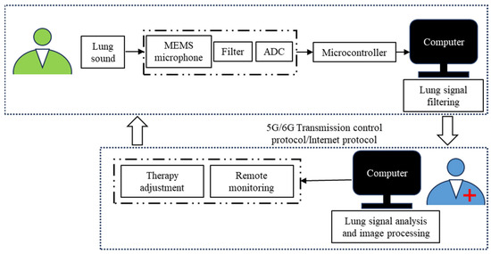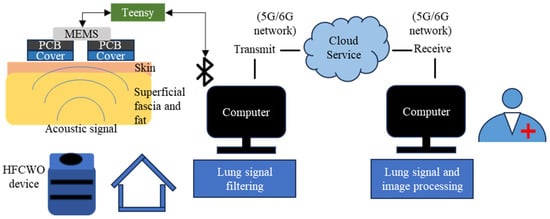 The acoustic signals can be collected in real-time on the patient’s computer for signal filtering and then transmitted to the doctor’s computer through the cloud platform for lung signal and image processing and conditioning. From the received lung signals through the cloud platform-specific software or equipment, the authorized doctor or clinicians can optimize respiratory therapy through real-time adjustments of parameter settings, in particular for high-frequency chest wall oscillation devices.