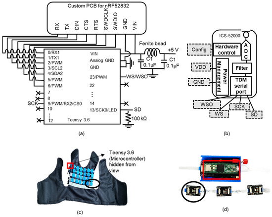 Overview of the proposed system hardware components. (a) Digital pin connection between nRF52832, MEMS microphone, and the Teensy 3.6 microcontroller for capturing lung sound signals; (b) the ICS-52000 MEMS microphone digital pin and its modules; (c) the proposed system overview; and (d) the interconnection between the array of MEMS microphones and the flexible printed cable.