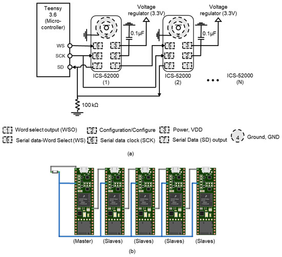 Overview of the connections between daisy-chained MEMS microphones and microcontroller. (a) System block diagram of digital pin connections for an array of MEMS microphones; (b) Teensy 3.6 boards’ connection for multiple arrays of a maximum of 16 MEMS microphones each, with the first Teensy 3.6 board as a control (master) with an activation switch and the subsequent Teensy 3.6 boards as slaves. Grey represents the ground connection, and blue represents the interconnection of digital pin 4 (SDA2).