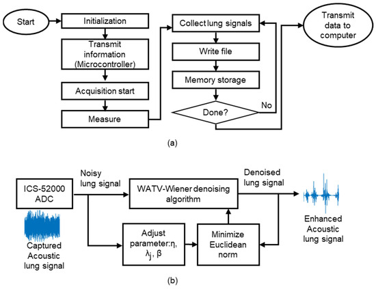 Proposed system’s input and output flow of the acoustic signal. (a) The proposed system’s software process flow chart; and (b) the proposed system’s acoustic signal processing flow chart.
