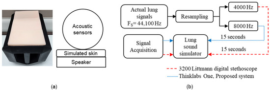 The setup for acquiring lung sound signals. (a) The lung sound simulator and its block diagram; and (b) the capturing of resampled lung sound signals flow chart.