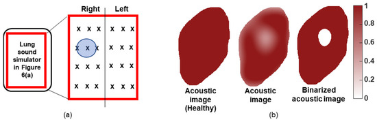 To emulate an airway obstruction in a controlled manner, water-filled bags of various diameters were placed on the right middle section of the lung sound simulator, as depicted in Figure 7. The water bag presents an acoustic damping effect that models the sound attenuation caused by a pulmonary nidus in actual airways [27,28,49]. Using a phantom obstruction allows for standardization versus variability between human subjects. The healthy lung sound sample played through the simulator provides a baseline reference for comparison. Testing on the phantom simulator aims to demonstrate the proposed system’s ability to detect and spatially localize the obstruction through translated acoustic lung images, before progressing to evaluations on patients with confirmed respiratory diseases.