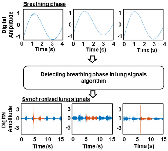 Synchronization of an array of lung signals captured at different times via the breathing phase. Blue denotes the asynchronous lung signals captured due to single point data. Red represents the synchronized lung signals via the breathing phase.