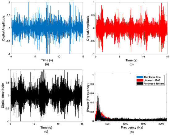 Recorded digital amplitude in relation to the respiratory sound signals and the frequency spectrum of the recorded lung signals. (a) Thinklabs One time-domain respiratory signals’ output, (b) Littmann 3200 time-domain respiratory signals’ output, (c) proposed system time-domain respiratory signals’ output, and (d) the frequency of interest for the three devices.