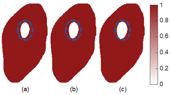 Acoustic imaging of obstructed airway translated from acquired lung signals with 50 mm nidus length via the waterbag simulation, where the encircled dotted line indicates the actual waterbag size. (a) Thinklabs One, (b) Littmann 3200, and (c) the proposed system.