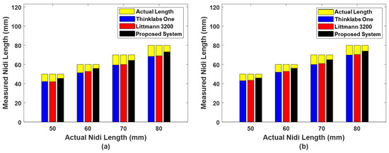 As shown in Figure 11 and Figure 12, the proposed system achieved a 91% mean accuracy in detecting the true nidus length from the microphone array signals. The stethoscopes had an 85% mean accuracy. This suggests that multi-sensor noise resilience provides higher fidelity imaging and reliable signals that translate to more accurate acoustic representations [12,13,14,52]. The results in Figure 11 and Figure 12 demonstrate the potential for frequent regional lung assessments and targeted therapy via imaging. Thus, the reported MEMS microphone array system can be widely used in the IoT or IoMT-driven remote monitoring system for continual monitoring of the respiratory signals, which vastly reduces the frequency of contact between patients and doctors/clinicians and the transportation risk as described in Section 1 and Section 2.