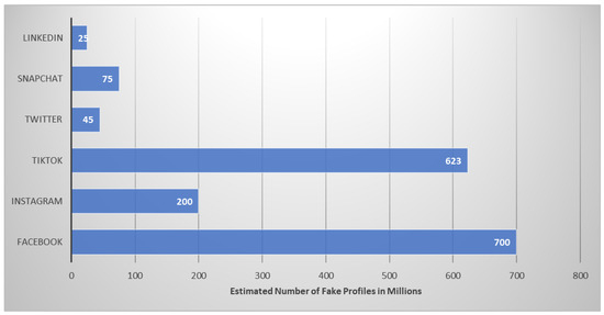 The ubiquitous expansion and adoption of social media platforms has spawned a parallel realm of digital deception. Within this realm, fake profiles—comprising automated social bots, also known as Sybils, impersonators, and fictitious identities—infiltrate user networks, often with malicious intent [74]. The estimated number of fake profiles on the major social networks is illustrated in Figure 4. According to Ref. [75], fake profiles are extensively utilized in perpetrating sophisticated financial scams, such as pig butchering scams, which have collectively defrauded hundreds of thousands of Americans, amounting to approximately USD 429 million [76]. The anonymity and ease of creating such profiles have significantly contributed to their proliferation. Typically, a user on OSNs is identified by a profile containing a picture, name, and possibly additional details like address and birth date. However, Ref. [45] contends that these sites often lack stringent verification mechanisms to confirm whether the individual referenced in the profile genuinely created and manages it. Studies highlight the alarming prevalence of fake profiles, with estimates suggesting millions operate across various social media platforms. These deceptive entities serve as conduits for disseminating misinformation, perpetrating financial scams, engaging in identity theft, perpetrating sexual harassment, and orchestrating targeted manipulation, thereby posing a major threat to the cyber-security and welfare of users [77].