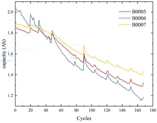 This paper utilizes the publicly available lithium battery accelerated aging experiment cycle dataset from NASA [34]. The dataset has undergone rigorous testing and encompasses a wide range of physical indicators of batteries. It is open, practical, and can provide reliable support for in-depth analysis of the impact of parameter changes during charging and discharging on battery performance. Three sets of batteries, B0005, B0006, and B0007, were selected as experimental subjects for cross-validation. All three sets of batteries were under the same operating conditions. Charging is conducted at a constant current (CC) of 1.5 A until the battery voltage reaches 4.2 V, then it continues in constant voltage (CV) mode until the charging current drops to 20 mA. Discharge is performed at a constant current (CC) level of 2 A until the battery voltages of cells 5, 6, and 7 drop to 2.7 V, 2.5 V, and 2.2 V, respectively. Cycle data parameters encompass battery temperature, charging and discharging currents and voltages, and corresponding times. Table 1 delineates the battery’s characteristics. Figure 1 illustrates the process of battery capacity decay with increasing number of cycles for three batteries in an environment at room temperature of 24 °C.