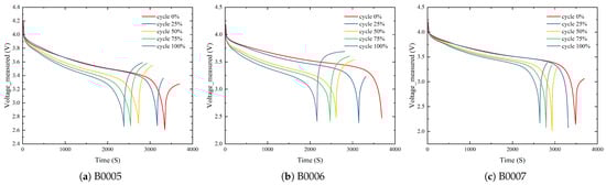 Lithium-ion battery cyclic data could reflect the process of battery life decay. By analyzing the correlation of physical parameters in the cycle data, relevant parameters that depict the health status of lithium batteries, namely HIs, are extracted. HIs contain the trends and characteristics of battery health status changes. This paper extracts parameters related to indirect HIs from the lithium battery cyclic dataset as characteristic indicators of lithium battery health status [35]. Before conducting correlation analysis, this paper first analyzed the physical data collected from the cyclic data to ensure the rationality of health indicator selection. Figure 2 shows the voltage curves of three sets of batteries with discharge time, and it also shows that the voltage curves exhibit clear trends, gradually shifting towards the negative direction of the x-axis with increasing cycle numbers. Therefore, it should be considered to extract HIs from the changes in load voltage during the discharge process. Additionally, the HIs were simultaneously extracted during the charging process for correlation analysis to ensure sufficient feature extraction. Specifically, this paper selected discharge peak voltage (DPT), average discharge voltage (ADV), as well as charging peak voltage (CPT) and average charging voltage (ACV) as alternative HIs.
