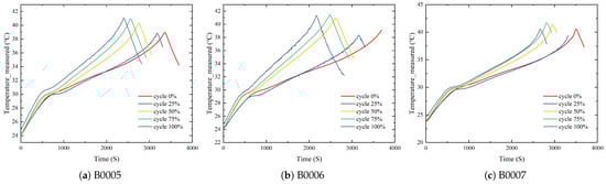 Changes in the discharge temperature of batteries with different cycle numbers over time.