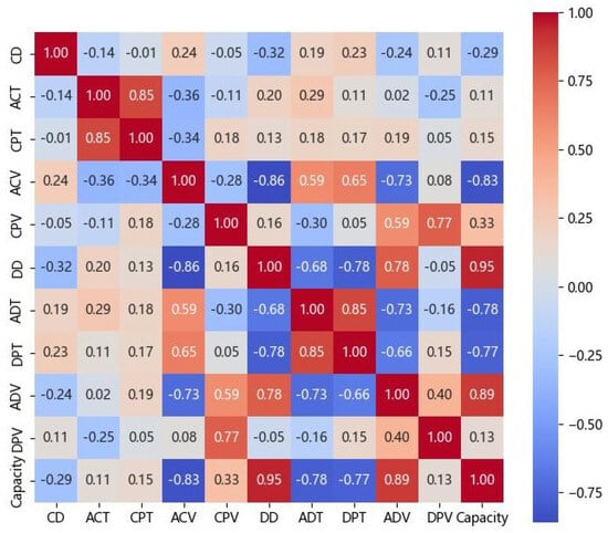 where represents the Pearson correlation coefficient between HIs x and capacity y. and , respectively, denote the i-th observation in the sample, and and represent the means of HIs and capacity. Perform Pearson correlation analysis on alternative HIs and battery capacity, calculating correlation coefficients. The correlation coefficient heatmap between HIs and capacity is shown in Figure 4, with specific correlation coefficient values listed in Table 2. According to the definition of Pearson correlation coefficient, HIs with larger absolute values of coefficients have stronger correlations with capacity, better explaining the variation in SOH. Therefore, this paper selects HIs with correlation coefficients greater than 0.7 as input features for the model. Average discharge voltage (ADV), discharge peak temperature (DPT), average discharge temperature (ADT), discharge duration (DD), and average charge voltage (ACV) are used as HIs for model training [36].