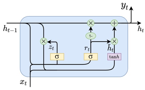 In 2014, introduced by Kyunghyun Cho et al., the gated recurrent unit (GRU) was devised to tackle the issue of gradient vanishing or explosion encountered by conventional RNNs when handling lengthy sequence tasks, thereby addressing the difficulty in capturing long-distance dependencies within sequences [37]. In contrast to LSTM, GRU boasts a more straightforward structure and fewer parameters, rendering it advantageous in tasks involving smaller datasets and aiding in overfitting prevention [38]. The unit structure of GRU is depicted in Figure 5.