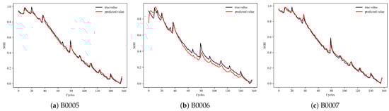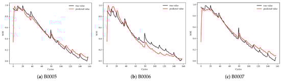 It can be observed that models trained with B0005 and B0006 as the input set, B0007 as the validation set, as well as models trained with B0006 and B0007 as the input set, B0005 as the validation set, all demonstrated excellent performance, with three evaluation metrics reaching their minimum values compared to other models. Due to significant differences in the overall trends of B0006 cyclic data compared to B0005 and B0007, models trained with B0007 and B0005 and tested with B0006 yielded relatively poorer performance. However, compared to other baseline models trained with B0007 and B0005, there was still significant performance improvement.