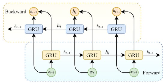 BiGRU combines multiple independent GRU models. The forward GRU propagates information along the sequence in the forward direction, while the backward GRU along the reverse direction. These independent models derive hidden states separately then merge and calculate to obtain a comprehensive hidden state at each time step. The network structure of BiGRU, which could simultaneously explore past and future information in time-series data, thereby overcoming performance errors caused by the phenomenon of capacity recovery in lithium batteries, could more accurately extract the SOH degradation features of lithium batteries. The structure of the BiGRU network is shown in Figure 7.