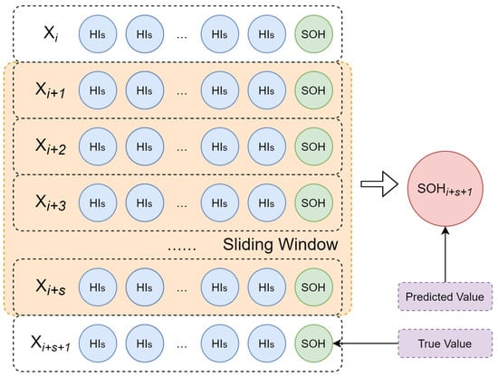 To comprehensively capture the time-dependent characteristics in lithium battery cycling data, this paper adopts the sliding window technique to partition the data, aiming to preserve the original structure and temporal continuity of the data. The sliding window has a step size of 1, sliding on the data sequence, and each sliding takes s columns of data as input, where s represents the size of the sliding window. represents the ith column of input data, containing 5 highly correlated health indicators selected and the current SOH status, serving as the input for training the model. The structure of the input and output data is shown in Figure 9. Due to the close correlation between the health status of lithium batteries and their historical data, using a sliding window can ensure that the model captures the evolution of battery health status over time. Sliding a fixed-size window along the time axis allows for the generation of continuous and overlapping subsequences from historical data, aiding the model in better understanding the operation process of the battery and changes in its health status.