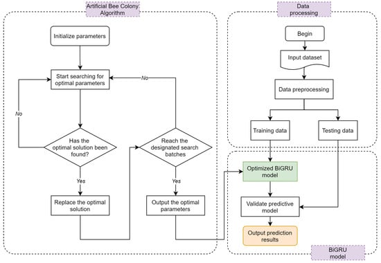 - The artificial bee colony intelligent algorithm was introduced as a means of model optimization, conducting hyperparameter tuning for the BiGRU model, enabling effective search for the optimal hyperparameter combination of the BiGRU model;