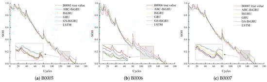 Meanwhile, in order to verify the validity and reliability of the ABC-BiGRU prediction model, we conducted model comparison experiments using M1 (GRU), M2 (LSTM), M3 (BiGRU), M4 (BiGRU based on grid search), and M5 (ABC-BiGRU), as detailed in Table 5. The performance advantages of ABC-BiGRU in the SOH prediction task are compared by analyzing the performance of different types of recurrent neural network models in the SOH prediction task.