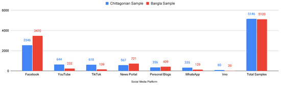 The data collection for this study was conducted manually from April to June 2022. A total of 5120 Bangla and 5146 Chittagonian samples were obtained from a diverse set of online platforms, including social media sites, forums, and comment sections of various websites.
