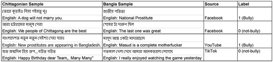 The subsequent sections elaborate in detail on the process and outcomes of this study, thus offering insights that could bolster strategies for addressing cyberbullying in the Bangla and Chittagonian linguistic domains.