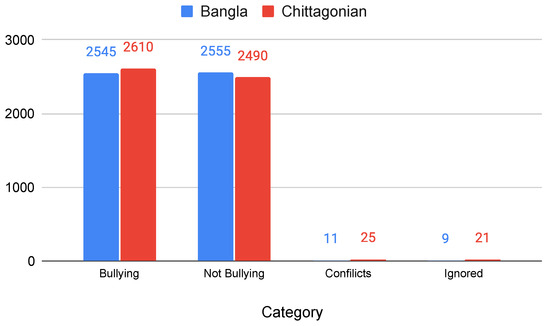 In fact, the datasets used in our study for Bangla and Chittagonian were balanced, with roughly equal numbers of texts falling into the categories of “bullying” and “not bullying”. In the Bangla dataset, 2545 instances were classified as bullying and 2555 instances were classified as nonbullying. Similarly, there were 2610 bullying instances and 2490 nonbullying instances in the Chittagonian dataset (See