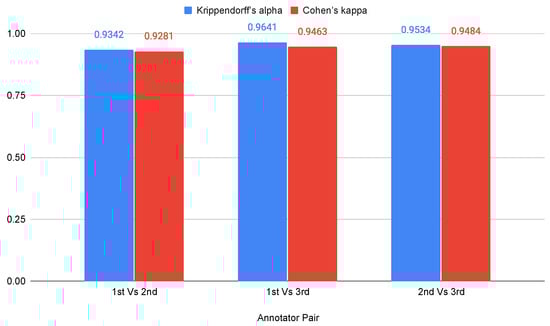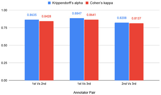 Thorough manual labeling by human annotators guaranteed the production of quality ground truth data for both model training and evaluation. This quality was further verified through the rigorous assessment of Krippendorff’s alpha and Cohen’s kappa scores.