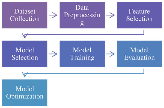 The sequential steps involved in the intrusion detection process using machine learning are depicted in Figure 1. It begins with dataset collection, where data relevant to both normal and malicious activities are gathered. Subsequently, data preprocessing ensures the data’s cleanliness, transformation, and formatting for analysis. Following this, feature selection identifies the most informative attributes for model training. Model selection involves choosing an appropriate algorithm tailored to the problem at hand, while model training allows the model to learn from the preprocessed data. Model evaluation assesses the model’s performance using validation datasets, and model optimization fine-tunes the model for enhanced accuracy.