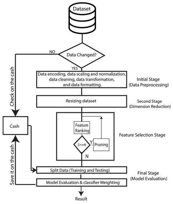 Incorporating a caching mechanism significantly improves the efficiency of our feature selection methodology. Throughout our proposed approach, the system meticulously identifies and caches the most significant features for subsequent iterations. After each iteration, the system checks the dataset’s feature count. Unchanged counts prompt the retrieval of previously selected features from the cache, streamlining the process to the final evaluation stage. Conversely, any change in feature count mandates a fresh execution through all four stages, commencing with data preprocessing and culminating in model evaluation.