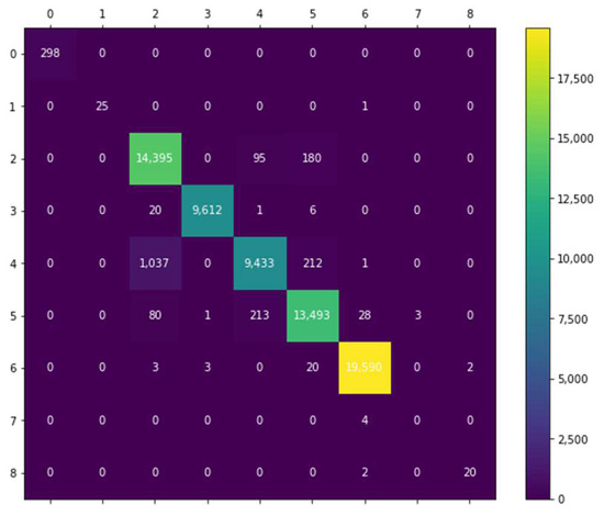 The confusion matrix is square, indicating that there are nine classes in total. Each class’s sample count corresponds to the value along the diagonal, which represents the number of true positive predictions for each class. The matrix also provides data on misclassifications; for instance, instances where Class 2 is predicted to be Class 5 (180 instances) or Class 4 is predicted to be Class 5 (213 instances). However, there is an anomaly with Class 7, which does not shows any correct classifications, suggesting that there is an error in the model or the data, or perhaps it is a class without instances.