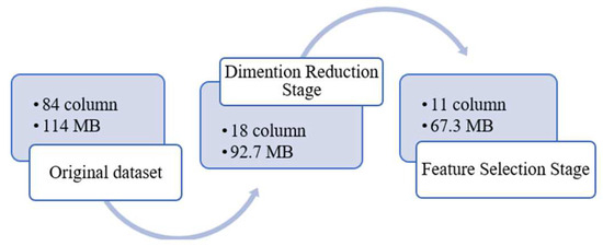 In our proposed system, we have different stages: the initial stage (data preprocessing), second stage (dimension reduction), the feature selection stage, and the final stage (model evaluation). After each stage, we preserved the dataset for size comparison, as illustrated in Figure 4. The original InSDN dataset consists of 84 features. However, after applying the dimension reduction algorithm in the second stage, the dataset is reduced to only 18 columns. The ultimate dataset is further refined, retaining the top 11 features. The most important features are shown in Figure 5.