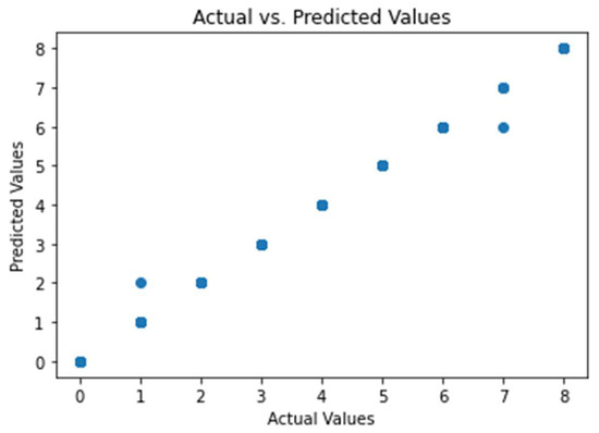 The proposed model achieved excellent results with an accuracy of 99.99%, a precision of 99.99%, a recall of 99.99%, an ROC score of 0.99997, and a computational cost of 0.8599 s when using 11 features. Figure 6 depicts the module’s results with actual versus predicted values.