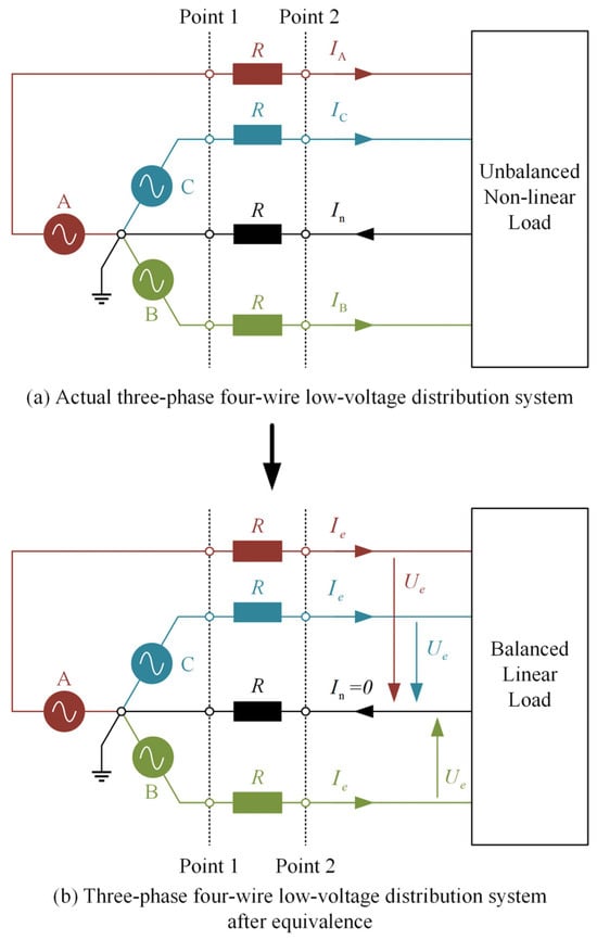 In Figure 4, R is the line resistance. When a non-linear load is connected to the system, the three-phase currents IA, IB, IC, and neutral current In produce line loss in the line resistance R. The three-phase voltage, current, and phase angle information at measurement Point 2 is collected, and the original three-phase system is equivalently transformed to decompose the load measurement equivalent apparent power Se [24,25]. The equivalent system has the same line power losses as the actual distribution system, and Figure 4 shows a schematic diagram of the three-phase, four-wire low-voltage distribution system after introducing the equivalence.