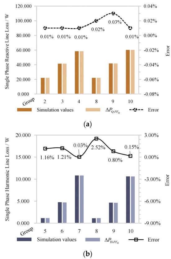 (a) Single-phase simulated reactive line loss comparison chart; (b) Single-phase simulated harmonic line loss comparison chart.