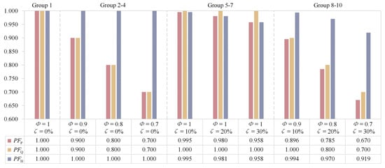 As can be seen from Figure 8, when the system has no reactive and harmonic problems, i.e., in a “perfect” single-phase system, the active line power factor PFQ, the reactive line loss assessment index PFQ, and the harmonic line loss assessment index PFH are one; when the power factor Φ decreases and the current harmonic content ζ increases, the active line power factor PFP, the reactive line loss assessment index PFQ, and the harmonic line loss assessment index PFH are reduced. In addition, the three line loss assessment indicators can clearly characterize the severity of the system’s line loss caused by power quality problems, whether it is a single power quality problem or a compound power quality problem, which shows that it is feasible to use the three line loss power factors to assess the system’s power quality line loss.