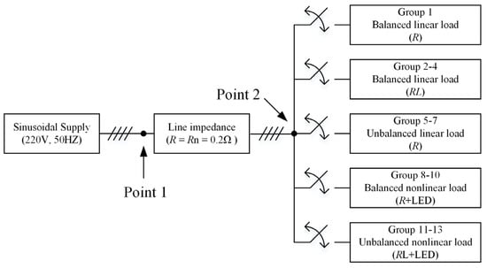 The proposed method underwent validation using a simplistic test system, as illustrated in Figure 5, to address the single-phase non-sinusoidal scenario. Among them, Group 1 is a perfect single-phase sinusoidal simulation group with a power factor of 1.0. Groups 2–4 are single-phase sinusoidal simulation groups with reactive power, current harmonic content THDI of 0%, and power factor gradually decreasing from 0.9 to 0.7 in steps of 0.1. Groups 5–7 are single-phase harmonic simulation groups with a power factor of 1.0, and current harmonic content THDI gradually increases from 10% to 30% in steps of 10%. Groups 8–10 are single-phase harmonic simulation groups with compound power quality problems. Simulink was employed to manipulate the reactive and harmonic power at varying levels, facilitating the simulation of different degrees of reactive and harmonic problem load groups, thereby emulating diverse system operation states.