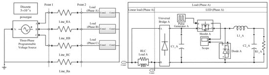 The simulation model was created in the Simulink environment, and the load used to simulate users consisted of a linear load and LED. The load in Groups 1 to 7 only contains linear load, and the load in Groups 8 to 13 contains both linear load and LED, as shown in Figure 10. The varying degrees of power quality problems in the three-phase simulation model are realized by changing the value of R1 in the LED module and the RLC load. In the LED simulation model for phase A, capacitor C1_A is set to 440 × 10−6 F, capacitor C2_A is set to 200 × 10−5 F, and inductor L1_A is set to 200 × 10−5 H. The settings of the Pulse Generator module, Mosfet module, and diode module for phase A are shown in Table 2. The LED module simulation settings for phase B and phase C are the same as for phase A.