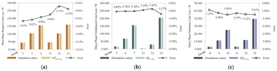 As can be seen in Table 6a,b and Figure 11, compared to the simulated measured line loss values for the three-phase system, the error in the calculated line loss values for each component using the four line loss power factors is small, with the error in all 13 sets of simulated results not exceeding 2%, which indicates that it is theoretically feasible to calculate the additional line loss values for the decoupled power quality using the four line loss power factors.