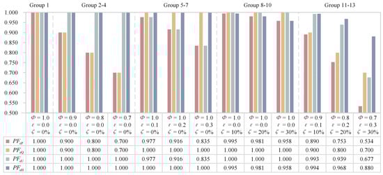 As can be seen from Figure 12, when the system has no reactive, harmonic, and unbalance problems, i.e., in a “perfect” three-phase system, all four power quality line loss power factors are 1. When the power factor Φ decreases, the current harmonic content ζ increases and the unbalance ε increases, the fundamental positive sequence active line loss power factor PFeP, reactive line loss power factor PFeQ, unbalanced line loss power factor PFeU, and harmonic line loss power factor PFeH will decrease. Whether the system has a single power quality problem or a compound power quality problem, the line loss power factor is an effective way to assess the severity of the system’s power quality line loss problem.
