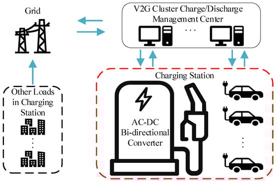 Due to global efforts to reduce carbon emissions and improve energy efficiency, the development and application of electric vehicles (EVs) have been widely promoted []. However, with the popularity of EVs, they impose a significant load on the distribution network and affect the stability of the grid [,]. Vehicle-to-grid (V2G) technology, shown in Figure 1, is proposed to better alleviate this problem through intelligent energy management and control between the EV energy storage system and the grid in order to achieve a more stable two-way power flow []. But, the process of EVs-charging and V2G cannot be separated from the use of converters such as DC-AC and DC-DC []. Therefore, it becomes crucial to control the bi-directional DC-AC converter to enhance the stability of power flow in V2G technology. Conventional full-bridge DC-AC converters have switching dead time, which causes the distortion of the output waveform, reduces efficiency and increases losses. Common mode current is generated under unipolar modulation, which requires auxiliary circuits to eliminate leakage currents and increase the complexity of the circuit. Dual-buck half-bridge converters are characterized by high reliability, no dead time and no leakage current generation [,,], which has ability to overcome the above drawbacks. Hence, it is proposed to apply in areas requiring high power reliability and efficiency, like EVs [].