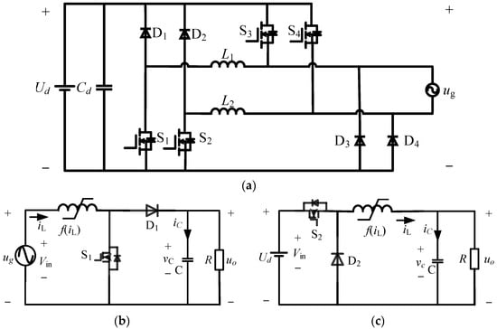 The dual-buck bi-directional converter solves the problems existing in the traditional bridge circuit structure [], and its topology is shown in Figure 2a. ug is the voltage at the grid terminal and Uin is the DC bus voltage. The circuit is topologically equivalent to a collection of two buck circuits: Uin passes through the regulator filter capacitor Cd, diodes D1, inductor L1 and power switches S1 and S4 to form the first buck circuit, and diodes D2, inductor L2 and power switches S2 and S3 to form the other buck circuit. S1 and S2 are high-frequency MOS power switches and S3 and S4 are two industrial-frequency (50 Hz) power switches that can be designed as zero-current switches. In addition, the operation modes of the bi-directional converter can be categorized into rectifier and inverter. The bi-directional converter judges the operation mode according to the bus voltage state, achieving bi-directional flow of power and power factor correction in the rectifier mode and reliable grid-connected operation in the inverter mode. When the converter is in rectifier mode, it is divided into four modes, as shown in Table 1, in a complete industrial frequency sinusoidal waveform. The circuit is symmetrical and equivalent to a dual-boost circuit under positive and negative half-cycle of AC voltage input. Its boost equivalent circuit for positive half-cycle is shown in Figure 2b. When the converter is in inverter mode, it is divided into four modes, as shown in Table 2. With the grid operating at positive and negative voltage half-cycles, the circuit loop is symmetrical and equivalent to a buck circuit. The buck equivalent circuit for positive half-cycle is shown in Figure 2c.