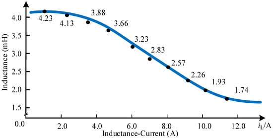 In actual systems, inductors are nonlinear electronic components. The nonlinear inductor is modeled based on the measured inductance data. The measured inductance curve with ferrite as the core material is shown in Figure 3, and the inductance value in the converter is updated by selecting the Lookup Table module in the MATLAB/Simulink (R2018b) environment to look up the table, taking the inductor current as the input and the inductance value obtained from Table 3 as the output.