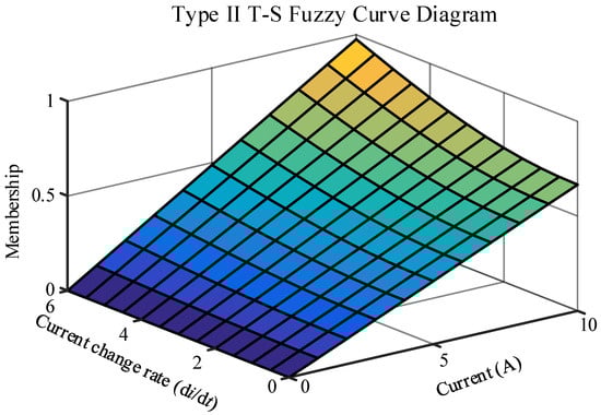 Simultaneously, the sub-membership function is then introduced as a basis for judging the degree of uncertainty, since the amount of variation of the current can represent this uncertainty to a certain extent. In this paper, the method of designing the sub-membership of type II T-S fuzzy is that the wider the change in current per unit of time, the larger the uncertainty disturbance brought about, and it is considered that this disturbance is more pronounced when the current value is large. Therefore, the derivative of the inductor current regarding time is selected as the horizontal coordinate of the sub-membership to characterize the degree of uncertainty within the system in terms of the sub-membership function, whose type-II T-S fuzzy surface is shown in Figure 5.