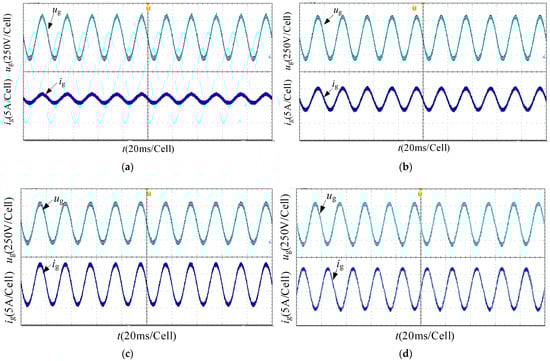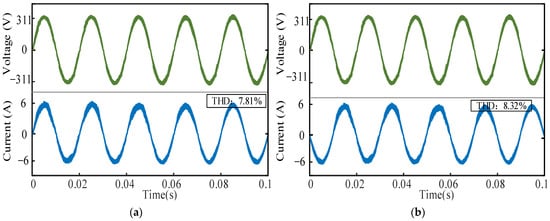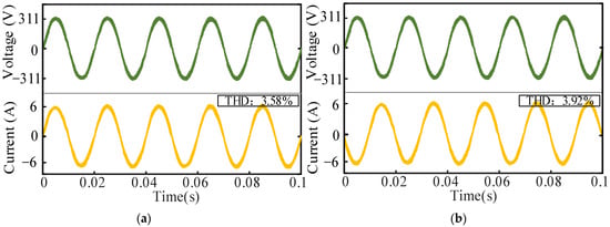 Type-II T-S fuzzy single-cycle control waveform under different power. (a) Light-load (200 W) rectified waveforms, THDi = 4.0%; (b) half-load (500 W) rectified waveform, THDi = 2.2%; (c,d) full-load (1000 W) rectified/inverter waveform, THDi = 2.6%/THDi = 2.7%, respectively.