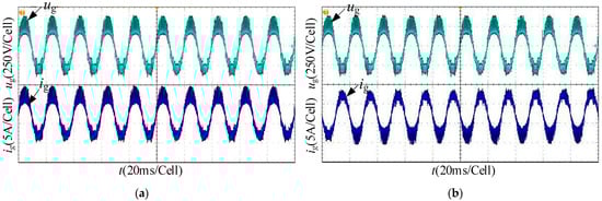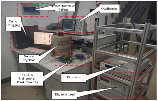 In this section, based on the previous theoretical derivation and simulation verification, an experimental prototype platform of a dual-buck bi-directional converter with 1000 W power was designed, and the results obtained were analyzed and discussed. The setup environment is shown in Figure 8, including a power distribution cabinet as ug, host computer, voltage regulator, dual-buck bi-directional converter, DC source, electronic load to simulate half-load, full-load, and non-linear loads, and an oscilloscope for observing and recording experimental results.