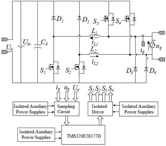 On the experimental prototype of dual-buck bi-directional converter, the main circuit in the hardware includes the main power circuit, control circuit and auxiliary circuit. The overall design scheme of the experiment is shown in Figure 9. A 32-bit high-resolution TMS320F28377D chip from Texas Instruments was used as the digital control chip, which sampled the grid-side current/voltage and DC-side bus voltage and performed real-time duty cycle calculations. Then, the opto-coupler-isolated PWM signal was output to control the power switches of the main power circuit. The experimental prototype system parameters of the dual-buck bi-directional converter are shown in Table 5. The detailed parameter design and software design process are described in the following.