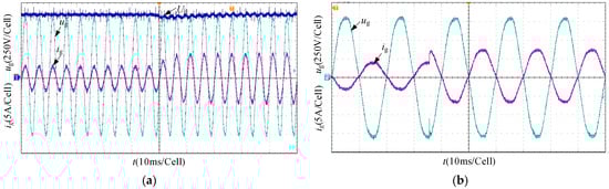 The dynamic response part (load switching) was added to verify the control effect of the voltage loop, and the waveforms are shown in Figure 12. The load-cutting experiments of inverter and rectifier were carried out respectively, and the waveforms prove that when the load is perturbed, the PI voltage outer loop of the dual-buck bi-directional DC-AC converter is able to respond to the changes in the load side quickly, with good robustness, and satisfy the characteristics of the output voltage stabilization under the load changes.